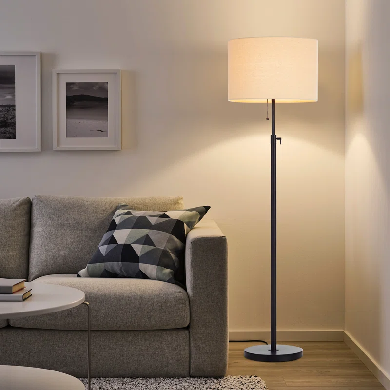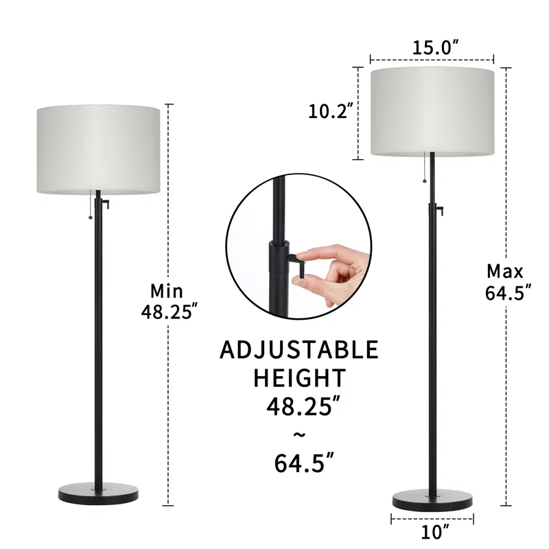 This traditional floor lamp with adjustable height, four finishes (black/antiqued/black and gold/red and gold), and a fabric drum lampshade combines classic style with versatility. The adjustable height feature allows you to customize the lamp to your desired level, while the fabric drum lampshade softens and evenly diffuses light for a cozy ambiance. This standard floor lamp is suitable for a bedroom, living room, or any space.